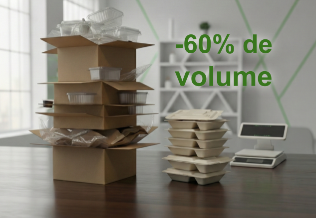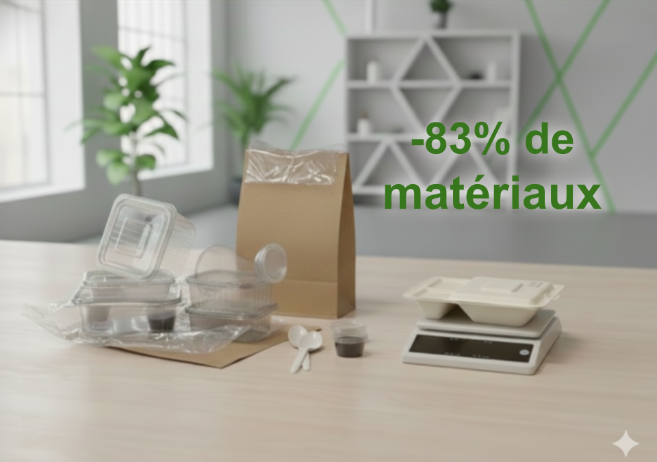 On ne parle plus d’un simple emballage, mais d’un support optimisé autour d’un repas complet. L’emballage est conçu en fibre végétale issue de la bagasse de canne à sucre, une ressource renouvelable, non alimentaire, qui valorise un résidu industriel au lieu de fabriquer un plastique supplémentaire d’origine fossile.